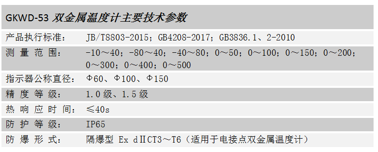 GKWD-53雙金屬溫度計是由兩種不同膨脹系數,彼此牢固結合的金屬作為感溫元件的接觸式直讀溫度儀表,適合測量中、低溫,現已成為溫度就地指示儀表的理想選擇。